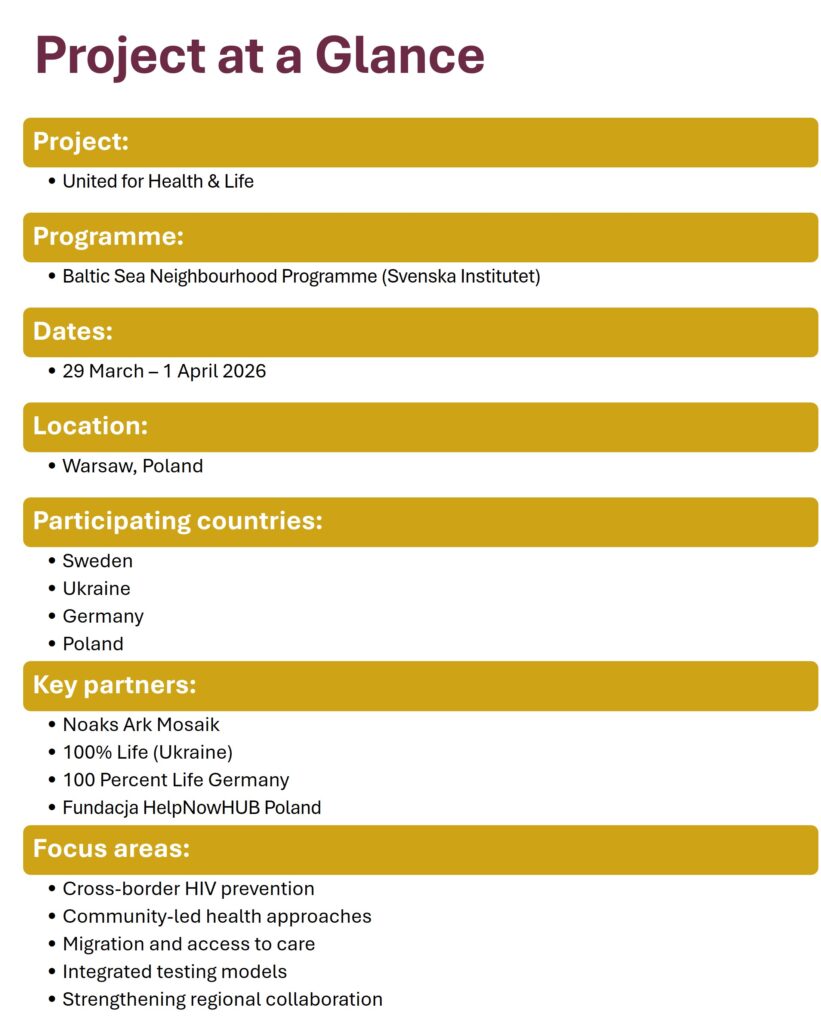 From 29 March to 1 April 2026, partners from Sweden, Ukraine, Poland, and Germany came together in Warsaw under the Baltic Sea Neighbourhood Programme for the “United for Health & Life” initiative. Organisations including Noaks Ark Mosaik, “100% Life”, and 100 Percent Life Germany joined forces to co-develop transnational solutions and share practices in HIV prevention across diverse contexts.