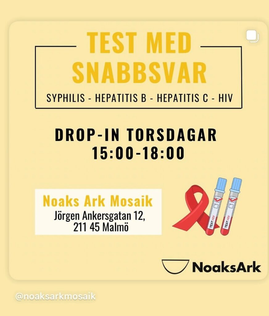 På torsdagar finns möjlighet att testa sig för hiv, Hepatit B och Hepatit C samt syfilis. Du behöver inte boka tid, öppet för drop-in mellan kl 15.00-18.00. Samtal och stöd finns såklart! Välkommen!