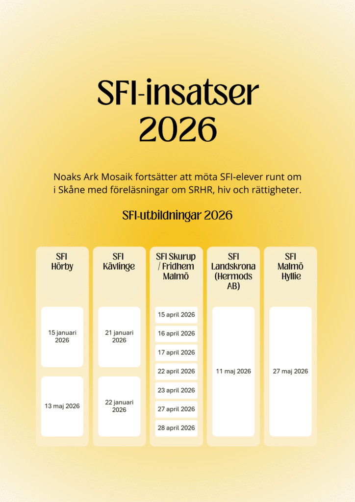 Tillgång till kunskap är en grundläggande förutsättning för god hälsa, delaktighet och egenmakt. För personer som är nya i Sverige kan tydlig och tillgänglig information om hälsa, rättigheter och relationer spela en avgörande roll. Därför fortsätter Noaks Ark Mosaik sitt långsiktiga arbete med utbildningsinsatser inom SFI även under 2026.